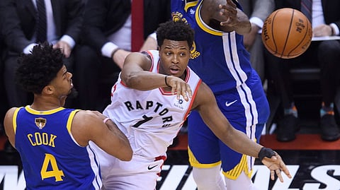 Raptors guard Kyle Lowry (7) passes while being defended by Warriors Draymond Green (23) and Quinn Cook in Game 1 on May 30 (Nathan Denette/The Canadian Press)Associated Press